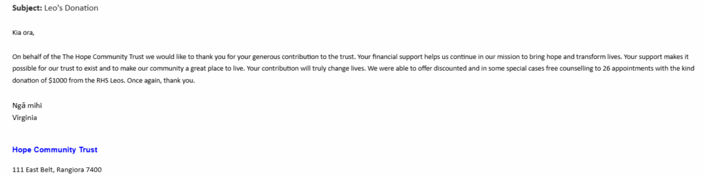 Rangiora High School Leos have donated $1000 to the Hope Community Trust, in support of the work they do with people in our local community. What a fantastic effort from this group – making a positive difference to the local community they live in! Ka pai te mahi!
